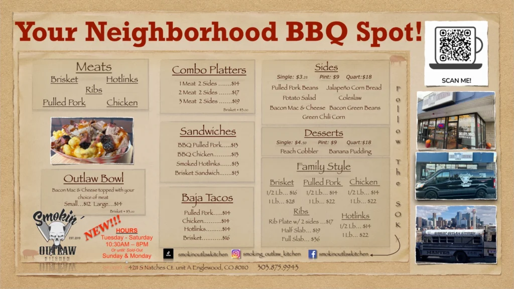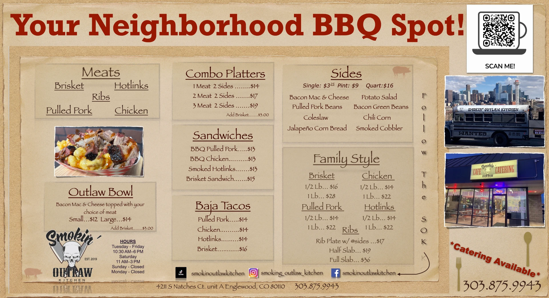 Check out Smokin' Outlaw Kitchen (SOK), a 9NEWS-featured spot serving up a unique BBQ experience. Founded by Brandon Hawks, who built his business from an old school bus food truck. SOK specializes in "Colorado style" BBQ, cooked low and slow in a custom smoker. Be sure to arrive early for their most popular items—the ribs and brisket—as they frequently sell out. Dine in and enjoy the great food and welcoming atmosphere!